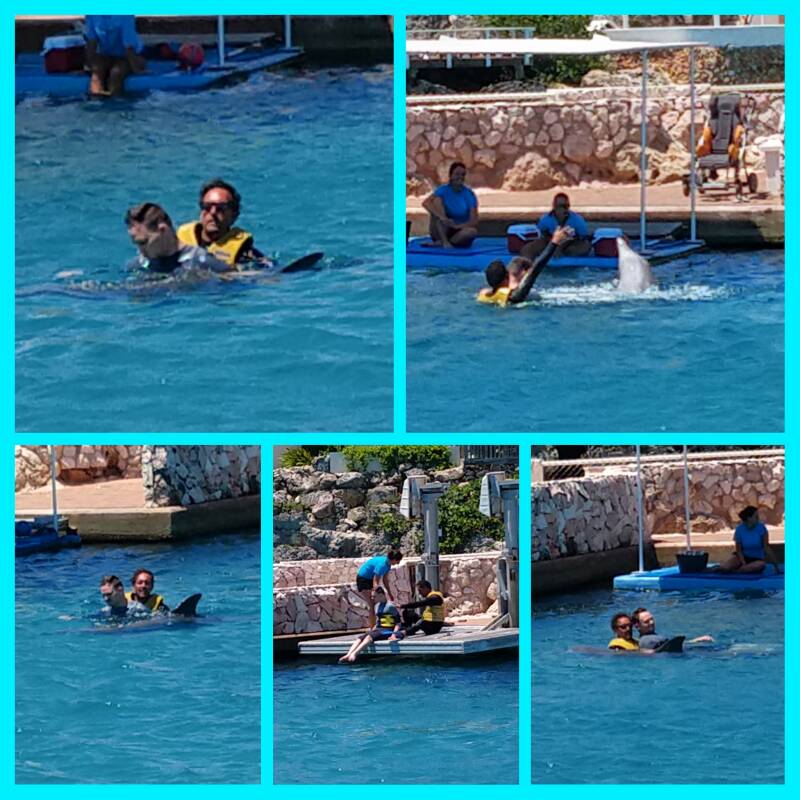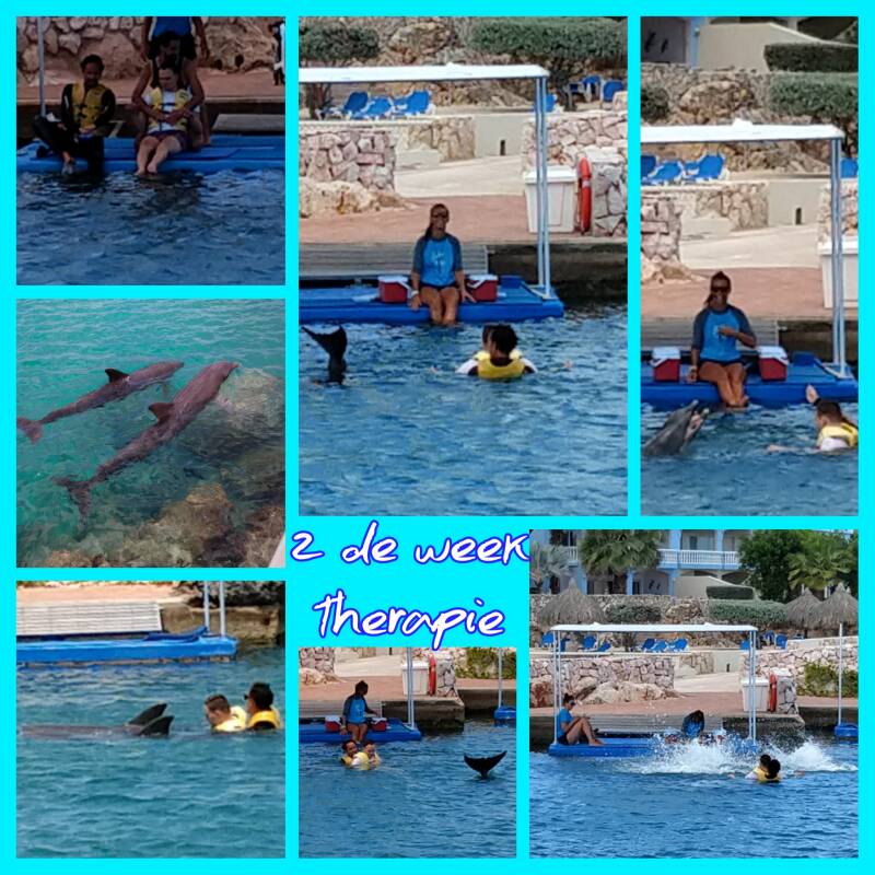 Vandaag is de laatste de dag van de tweede therapie week, behalve voor Niels. Morgenochtend mag Niels nog een keer zwemmen om de dokdag, waar de dames toen niet zo'n zin in hadden, in te halen. Bof voor de broers, zij mogen dan ook nog een keertje mee. Uiteraard begon vandaag de therapie weer binnen, Niels had er zin in want ik hoorde hem uit enthousiasme zelfs buiten. Goed geoefend en voortborduren op de afgelopen dagen. Wat daar wordt gesignaleerd zien wij ook, meer kunnen hebben en zelf prikkels beter kunnen reguleren. Duidelijk aangeven als iets minder leuk is en daar niet in blijven hangen wat aan het begin van het jaar echt wel anders kon zijn. We hopen en gaan ontdekken of dit stand mag houden als we straks weer in vertrouwde omgevingen zullen zijn. Daarna was het waterpret. De dames, Chabelita en Bonnie, namen hun tijd en in die tijd genoot Niels met Patrick van het water. Bonnie was al in weekend stemming en haakte soms voortijdig af. Er werden diverse zwemrondes afgelegd en ook de nodige oefeningen gedaan. Bij het spetteren liet Niels het vandaag aan de dolfijnen over, of als ze klaar waren liet hij zien hoe goed hij kan spetteren. Tsja, toen zaten twee weken therapie erop, gelukkig mogen wij morgen nog een keertje. Wel kregen we een fotoboek je met mooie foto's van Niels en de afgelopen weken, daarnaast een USB met de nodige foto's en filmpjes ook van het siblings programma. Dus we kunnen het allemaal nog eens herbeleven. De jongens hadden vanmiddag ook hun afscheid van de broers/zussen (siblings) van. Zij hebben met elkaar ook een hele leuke tijd gehad. Op naar morgen en ja, dan is het toch echt voorbij.
